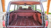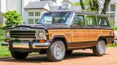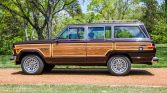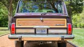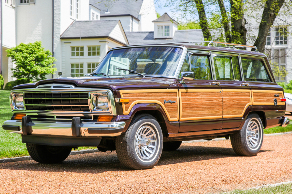 This 1989 Jeep Grand Wagoneer is finished in maroon over burgundy leather and powered by a 5.9-liter V8 paired with a three-speed automatic and Selec-Trac four-wheel drive. Features include woodgrain appliqué trim, a chrome roof rack, a receiver hitch, fog lights, power aLessories, air conditioning, and a factory cassette stereo.