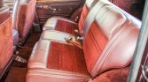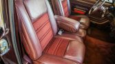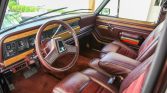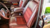 The cabin features seating upholstered in burgundy leather with Cumberland Cord fabric inserts as well as matching door panels and woodgrain trim. Amenities include electric windows and locks, power-adjustable front seats, air conditioning, cruise control, and a factory cassette stereo.
