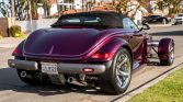This 1999 Plymouth Prowler is finished in purple over black, and its 3.5-liter V6 is paired with a four-speed automatic transmission. Features include pinstriping, a black soft top, staggered 17″ and 20″ wheels, four-wheel disc brakes, air conditioning, power windows, cruise control, a cassette stereo, and keyless entry.