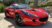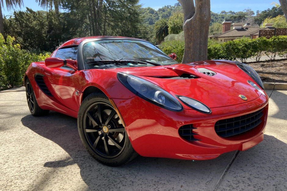 This 2006 Lotus Elise is finished in Ardent Red over a black interior, and power is provided by a 1.8-liter inline-four paired with a six-speed manual transaxle. Equipment includes a removable black soft top and a color-matched hardtop, air conditioning, a push-button start, and four-wheel disc brakes with cross-drilled rotors. Replacement tires were mounted, the engine computer received a software update, and a recall was performed on an oil cooler line in 2020.