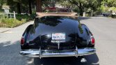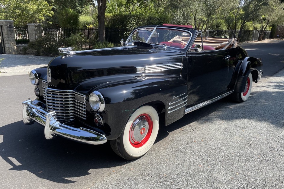 This 1941 Cadillac Series 62 convertible is finished in black over red and powered by a 346ci L-head V8 paired with a four-speed Hydra-Matic automatic transmission. Features include a tan convertible top, red-painted 15″ wheels with chrome hub caps, whitewall tires, chrome bumpers with overriders, and a split front windshield.