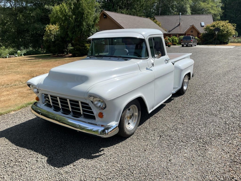 The truck is finished in white and features a step-side bed with oak bed flooring and stainless runners. Equipment includes a chrome grille, trim, and bumpers, a painted sun visor, dual exterior mirrors, and custom dual exhaust which exits below the rear bumper.