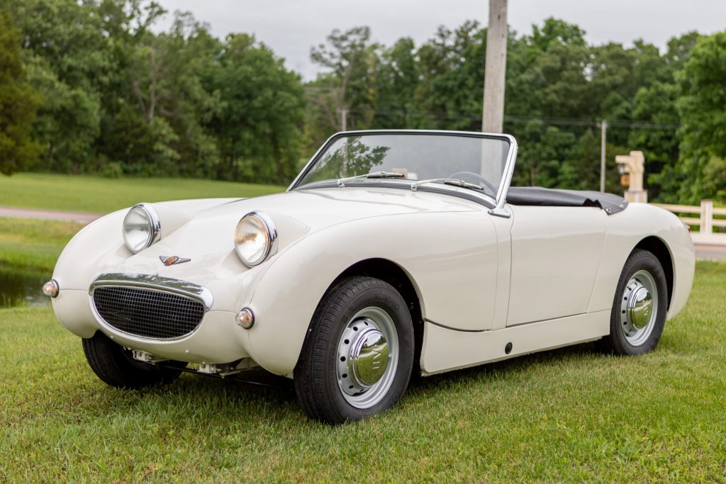 This 1959 Austin-Healey Bugeye Sprite was acquired by the seller in 2014 and was subsequently refurbished and modified. Work reportedly consisted of media blasting and rust repair, a repaint in white, an interior refresh, and overhauls of the suspension and brakes. The car is powered by a replacement 1,275cc inline-four paired with a four-speed manual transmission, and equipment includes front disc brakes, 13″ steel wheels with chrome center caps, a front-hinged hood, rear bumperettes, and a black tonneau cover.