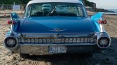 The steel wheels wear Cadillac Motor Division hubcaps, and they are mounted with L76–15 bias-ply whitewall tires. The Series 62 rode on a 130″ wheelbase for 1959 and featured an independent front suspension and a live rear axle with coil springs at all four corners. Power-assisted steering and four-wheel drum brakes were standard equipment.