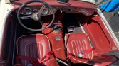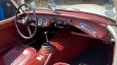 The cabin features bucket seats trimmed in red leather with white piping as well as a matching dashboard, door panels, and carpets, the latter of which cover Dynamat sound insulation. The rear-view mirror and a passenger grab-rail are mounted to the dashboard, and other equipment includes red seatbelts, embroidered floor mats, and a banjo-style steering wheel.
