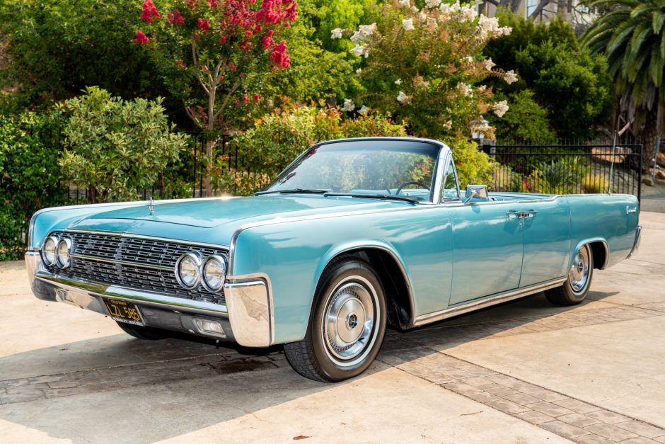 This 1962 Lincoln Continental convertible was purchased by the seller’s family in October 1963 from Berkeley Motors in Berkeley, California and acquired by the seller in 1999. The car is finished in Riviera Turquoise over a matching interior, and power is supplied by a 430ci V8 mated with a dual-range three-speed automatic transmission. Additional equipment includes a white convertible top, 15” wheels, rear-hinged rear doors, an automatic-dimming headlights system, a six-way power-adjustable bench seat, and an AM…