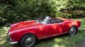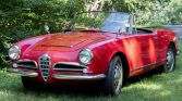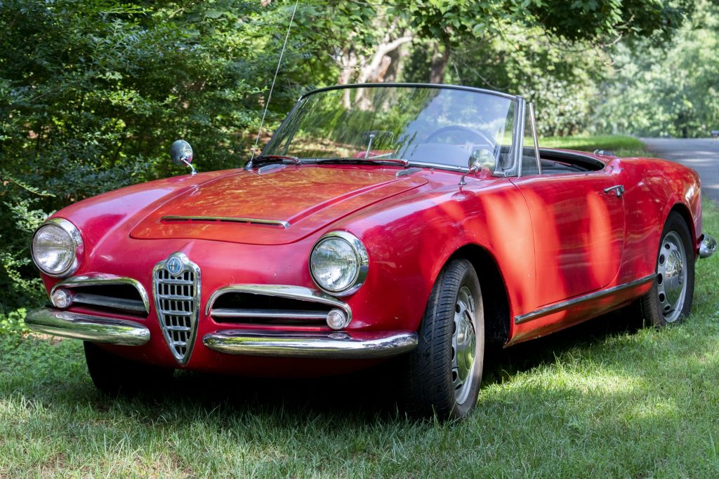 This 1963 Alfa Romeo Giulia Spider is finished in red over black upholstery, and power comes from a twin-cam 1.6L inline-four paired with a five-speed manual transmission. Features include a Weber carburetor, four-wheel three-shoe drum brakes, and fender-mounted mirrors. The car is said to run and drive, although rust repair is recommended by the seller along with engine, suspension, and upholstery work.