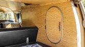 The rear of the cabin features gray carpets and wood paneling on the roof, door panels, and sides. Features include an ice chest, a fold-away table, storage cabinets, LED overhead lights, and folding bench seats trimmed in black vinyl. Wear is visible on one of the door panels. The seller notes that a coffee maker and camp-style propane stove are included in the sale.