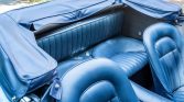 The interior features blue leather seats with matching door panels and carpeting. The dashboard is accented with burl wood panels, and additional equipment includes a heater, dash-mounted rearview mirror, banjo-style steering wheel, lap belts, and a trunk-mounted Alpine stereo with a CD changer.