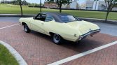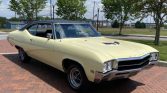 The body was refinished in the Buick shade of Cameo Cream with a black vinyl roof cover in 2022 according to the selling dealer. Other work included replacing the side mirrors and weatherstripping and re-chroming the bumpers. Red “GS” and “GS 400” badging adorns the grille, trunk lid, and rear quarter panels, and additional details include a dual exhaust system, quad headlights, and hood scoops.