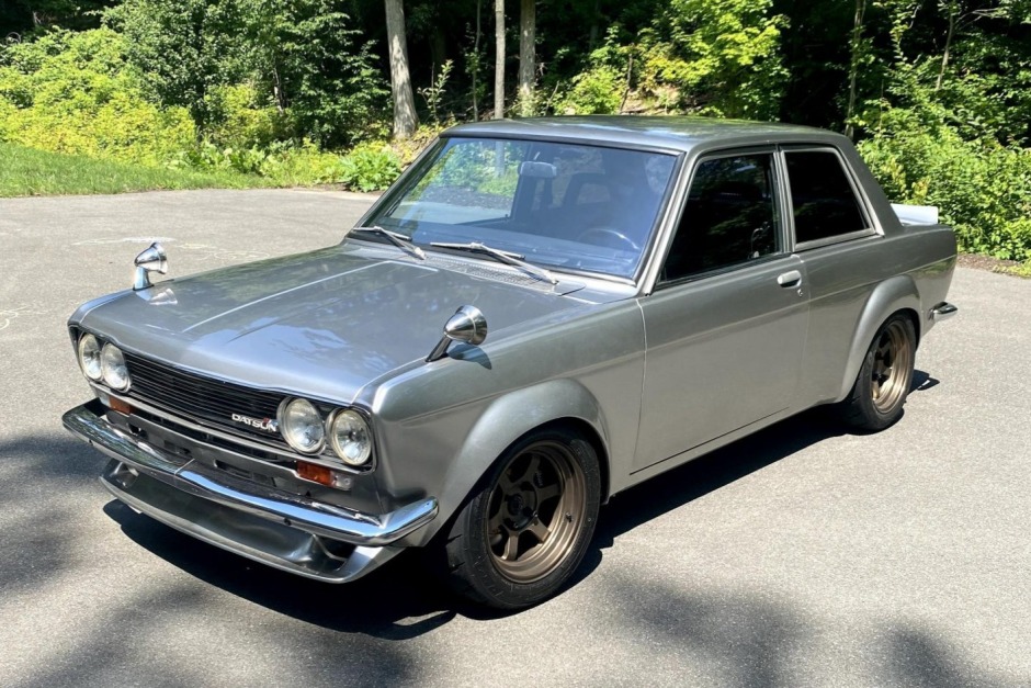 This 1970 Datsun 510 was acquired in 2018 by the seller and has since been modified with a 2.0-liter SR20DET fitted with a Garrett turbocharger, a CX Racing intercooler, and HKS camshafts. Power is sent to the rear wheels through a five-speed manual transmission with a Nismo twin-disc clutch and a limited-slip differential, and additional modifications include a repaint in Titanium Metallic and matching fender flares, along with 15″ Volk Racing wheels, Wilwood disc brakes, Techno Toy…