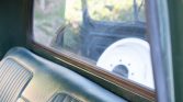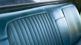 The bench seat is trimmed in green vinyl upholstery along with color-matched door panels and carpeting. Equipment includes a white headliner, an under-dash AM radio, Bass 48 overhead speakers, a heater, lap belts, and crank windows.