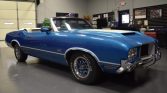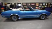 This 1971 Oldsmobile 442 convertible is finished in metallic blue with white stripes over blue upholstery and is powered by a replacement 455ci V8 paired with a three-speed TH400 automatic transmission. Additional equipment includes a power-operated white soft top, 14″ rally-style wheels, power-assisted front disc brakes, a ram-air hood, power-steering, air conditioning, a push-button radio, and an eight-track player. The seller acquired the car in November 2021, and subsequent work is said to have included reupholstering the soft top, overhauling the carburetor and cruise control transducer, and replacement of the spark plugs, tires, battery, and an exhaust manifold gasket.