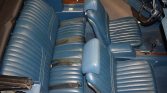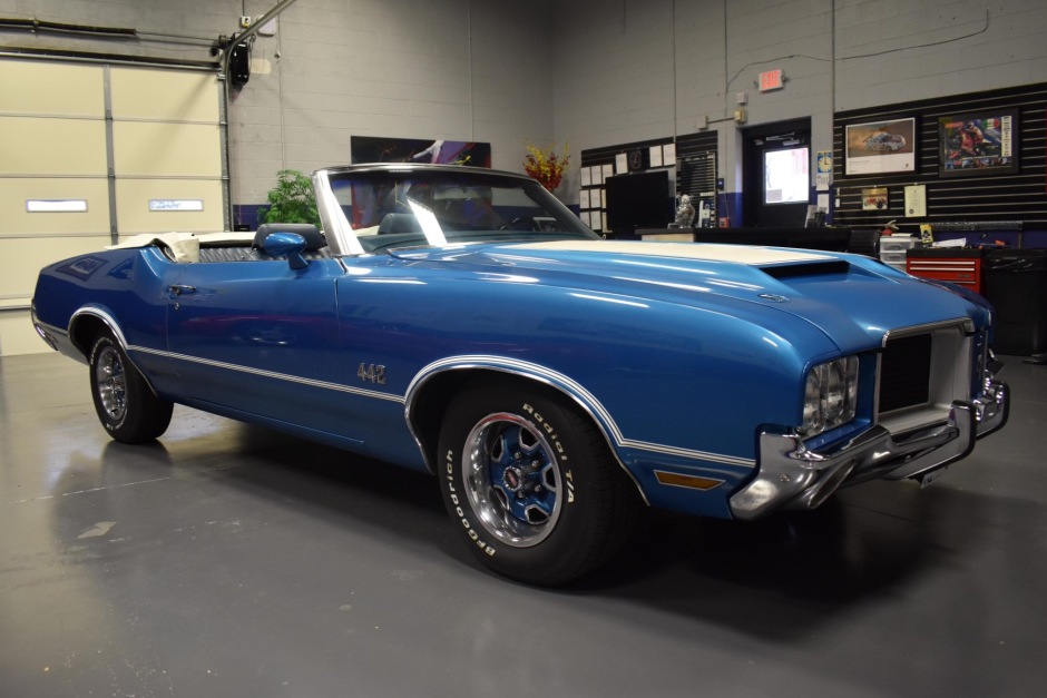 The car left the factory finished in Viking Blue (26) and is said to have been repainted during previous ownership. Features include a power-operated white soft top, a ram-air hood with white stripes and chrome twist locks, chrome bumpers with overriders, white side and decklid stripes, bright-finished trim, dual exhaust outlets, and “442” badging on the front grille, fenders, and decklid. Crazing is noted in the finish on the rear of the car, and additional work performed during current ownership is said to have included refinishing the driver-side rocker and reupholstering the soft top.