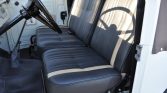 The interior features front bucket seats and inward-facing rear jump seats that have been reupholstered in black vinyl. The floors are protected by black covers, and equipment includes a glovebox and manual wind-up windows. Cabin switchgear has been labeled.