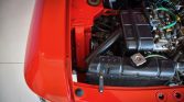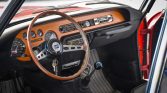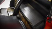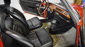 The cabin houses two bucket seats that are fitted with headrests and trimmed in black vinyl along with matching door panels and carpeting. Wood trim accents the dash and amenities include a push-button radio, a heater, a locking glove compartment, and a Valentini Gomma floor mat.