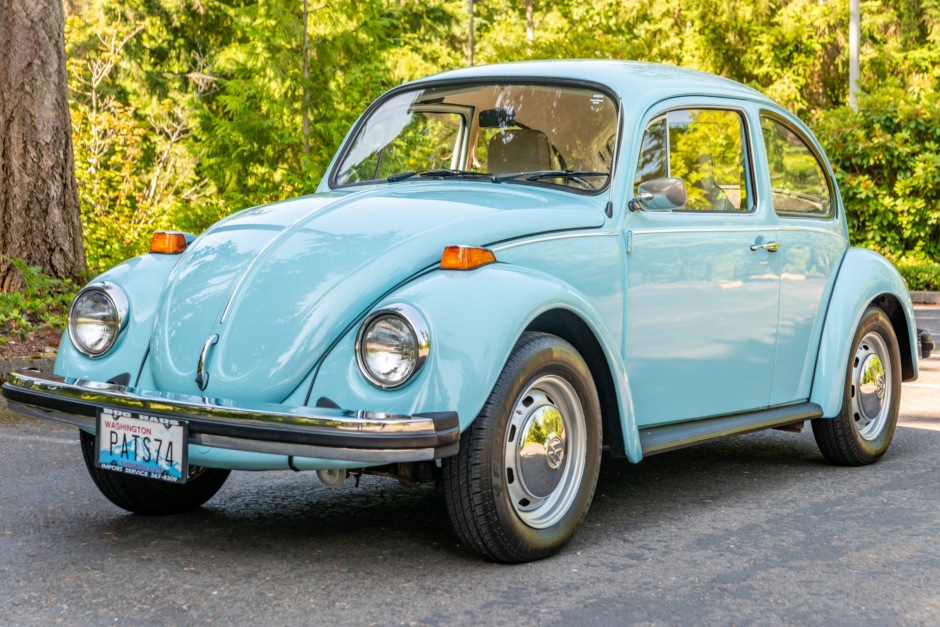 This 1974 Volkswagen Beetle was purchased new from Pete Lovely Volkswagen of Fife, Washington by the seller’s grandmother, was sold to an acquaintance in 1980 after her passing, and then acquired by the seller in 1985. The car is finished in blue over a white interior and is powered by a 1.6L flat-four paired with a four-speed manual transaxle. Equipment includes silver 15″ steel wheels with chrome hub caps, dual exhaust outlets, chrome bumpers and trim, and three-point front seat belts. Service in September 2020 included a valve adjustment and an engine oil change.