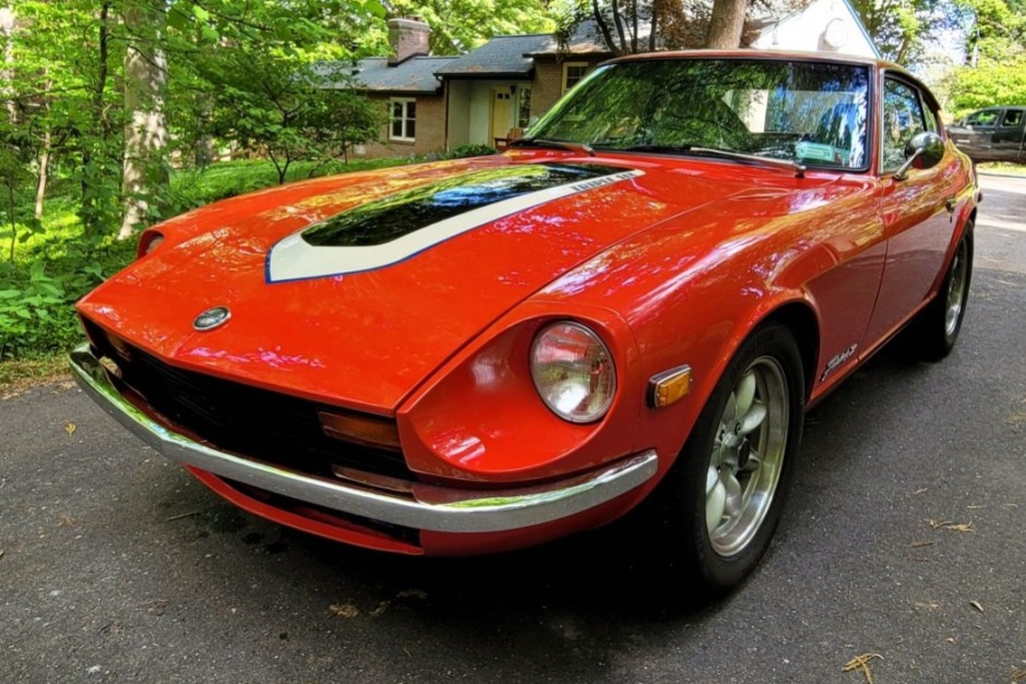 The car was repainted during prior ownership and is finished in orange with a black, blue, and white stripe on the center of the hood, along with a painted white roof panel. The rear bumper has been removed, while additional features include a chrome front bumper, US-spec side markers and mirrors, Fairlady Z badging, and a single exhaust outlet.