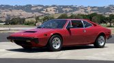 The 308 GT4 was the first production Ferrari to feature Bertone-styled bodywork, and this example wears an older repaint in red. Equipment includes pop-up headlights, black bumpers, polished window trim, Dino badging, and quad…