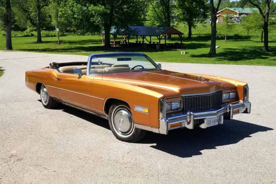 This 1976 Cadillac Eldorado convertible was purchased by the seller’s late uncle in May 2016 and later acquired by the seller in November 2019. The car is is finished in orange over tan upholstery, and is powered by a 500ci V8 paired with a three-speed automatic transaxle. Equipment includes a power-operated tan soft top, steel 15″ wheels with covers, air conditioning, cruise control, a power-adjustable split-bench front seat, electric windows, and a push-button AM/FM radio.