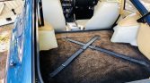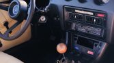 The seating surfaces are upholstered in cream vinyl with matching door panels complemented by a black dashboard, center console, and carpets. Amenities include air conditioning, a wood shift knob, and an armrest.