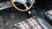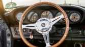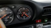 A 13″ wood-rimmed Moto-Lita steering wheel fronts a suite of VDO instrumentation that includes a 150-mph speedometer and a tachometer with a 6,200-rpm redline, as well as secondary gauges displaying fuel level, oil temperature, coolant temperature, and oil pressure. The six-digit mechanical odometer shows 114k miles.