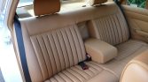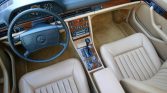 Palomino leather (274) covers the seating surfaces, arm rest, and door panels, while wood trim accents the cabin. Amenities include automatic climate control, a Becker Grand Prix cassette stereo, cruise control, and power-adjustable front seats. The air-conditioning system was recharged in 2020, and the radio was also reconditioned.