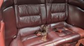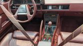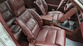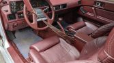 The cabin features bolstered seats upholstered in burgundy leather with a matching dashboard, center console, door panels, and carpets. Amenities include automatic climate control, cruise control, a cassette stereo with a graphic equalizer, power windows, and Turbo-branded automatic-retracting front seatbelts.