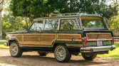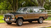 The truck is finished in black with faux woodgrain paneling over tan leather upholstery and is powered by a 5.9-liter V8 paired with a three-speed automatic transmission. Equipment includes Selec-Trac four-wheel drive, 15” alloy wheels, a chrome roof rack, fog lights, cruise control, air conditioning, and a factory AM/FM cassette stereo.