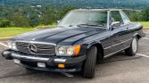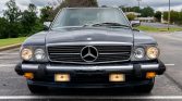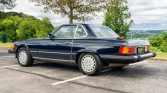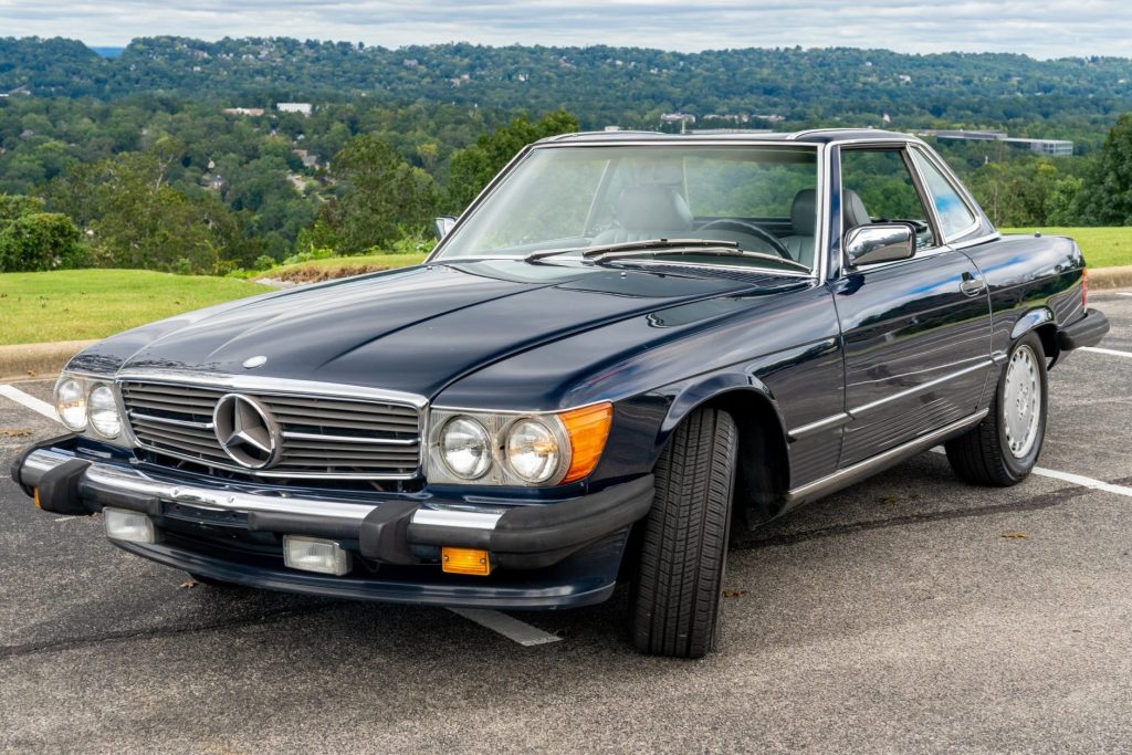 This 1987 Mercedes-Benz 560SL is finished in Midnight Blue over gray leather and is powered by a 5.5-liter V8 paired with a four-speed automatic transmission. Equipment includes a body-color removable hardtop, a blue soft top, painted 15″ Gullideckel alloy wheels, fog lights, automatic climate control, cruise control, a Becker Grand Prix AM/FM/cassette stereo, and an alarm system.