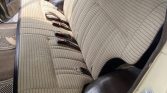 The cabin features front bucket seats upholstered in striped tan cloth with matching door panel inserts. Appointments include air conditioning, brown carpeting, a rear window defroster, manual windows, rubber floor mats, and an aftermarket CD stereo and speakers.