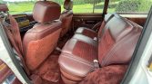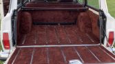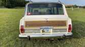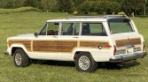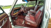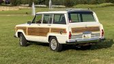 This 1988 Jeep Grand Wagoneer is finished in white with faux-wood paneling over a burgundy leather and cloth interior, and it is powered by a 5.9-liter V8 paired with a three-speed automatic transmission and a dual-range transfer case. Equipment includes 15″ alloy wheels, a roof rack, fog lights, power-adjustable front seats, power windows and locks, and a cassette stereo.