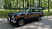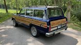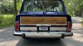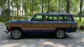 This 1991 Jeep Grand Wagoneer Final Edition is finished in blue over a beige interior and is powered by a 5.9-liter V8 paired with a three-speed automatic transmission and a dual-range transfer case. Equipment includes the Selec-Trac four-wheel drive system, alloy wheels, a sunroof, power-adjustable front seats, an overhead console, and a JVC CD stereo.