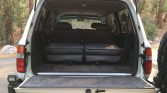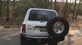 Factory 16″ five-spoke wheels are mounted with Cooper Discoverer tires. The suspension has been modified with Old Man Emu components including the shocks, springs, and steering stabilizer.