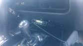 The cabin is upholstered in Graphite leather with matching door panels and carpets. Amenities include air conditioning, cruise control, and power-adjustable front seats. A touchscreen Pioneer head unit has been added, and a VHF radio is mounted below the dashboard. Wear is visible on the seat upholstery.