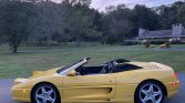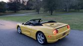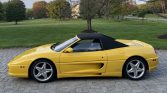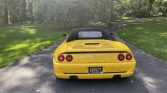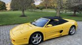This 1997 Ferrari F355 Spider is finished in Giallo Modena over black leather and is powered by a 3.5-liter DOHC V8 paired with a gated six-speed manual transaxle and a limited-slip differential. Features include a black convertible soft top, a Tubi muffler, a Kenwood stereo, automatic climate control, power windows, Gothspeed heat shields, pop-up headlamps, fog lights, and 18″ five-spoke wheels.