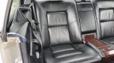 The cabin features seating trimmed in black Nappa leather with matching carpets, and burl wood veneers aLent the dashboard, center console, and door panels. Amenities include heated and power-adjustable front seats, an electric rear window shade, dual-zone automatic climate control, cruise control, and a Mercedes-Benz Exquisit cassette stereo.