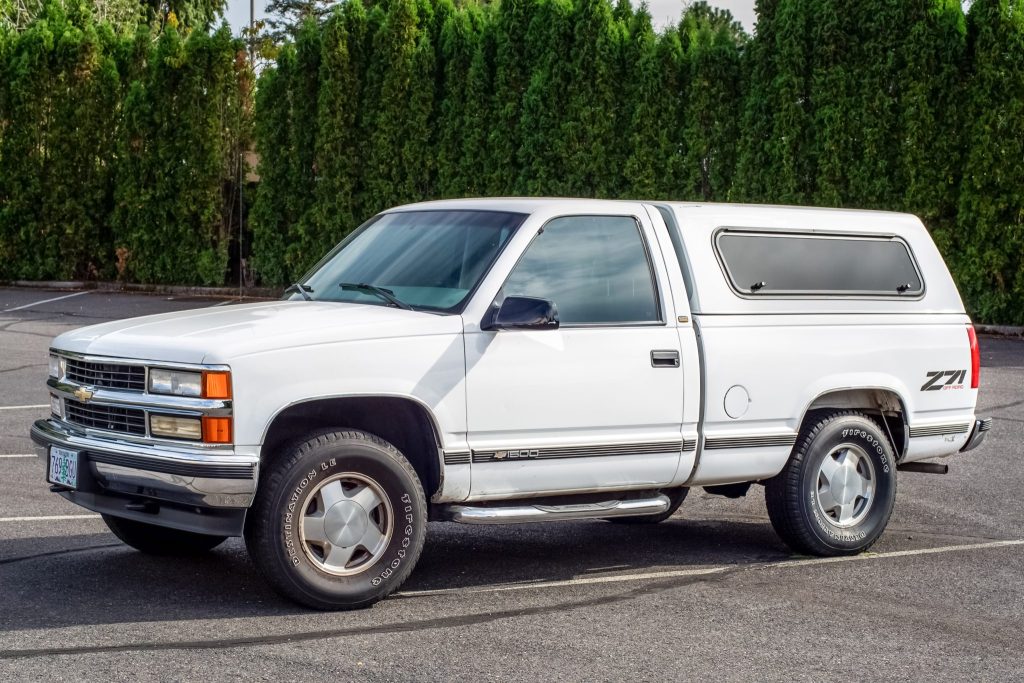 This 1998 Chevrolet K1500 Silverado 4×4 pickup now shows 56k miles with time spent in both Oregon and Hawaii. It is finished in Summit White over gray cloth and is powered by a 5.7-liter V8 linked with a four-speed automatic transmission and a dual-range transfer case. Features include an Airaid air-intake system, a Flowmaster exhaust system, a camper bed top, a receiver hitch, 16″ five-spoke alloy wheels, a power-adjustable split bench seat, an AM/FM stereo, a CD receiver,…