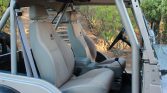 The interior features Bestop heated bucket seats upholstered in gray cloth joined by a body-color steel dash and floors coated in POR-15. A Pioneer AM/FM/CD head unit is installed within the lockable center console and is connected to overhead Sony speakers.
