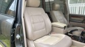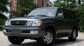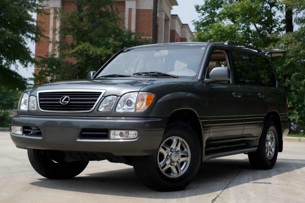 This 2002 Lexus LX470 was initially delivered to Lexus of Memphis, Tennessee, and spent time in Raleigh, North Carolina, before being acquired by the seller in May 2021. The truck is finished in Riverock Green Mica over ivory leather and is powered by a 4.7-liter 2UZ-FE V8 paired with a four-speed automatic transmission, a dual-range transfer case, and a locking center differential. Additional features include Adaptive Variable Suspension, Adjustable Height Control, fog lights, third-row seating, and power-adjustable and heated front seats.