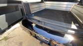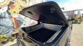 The bed and custom hydraulically-powered tonneau cover are made from plastic composites, and the side-hinged tailgate doors open to reveal a carpeted liner and stainless-steel side trim.