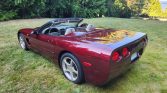 The car is finished in 50th Anniversary Red Metallic and features a Shale convertible soft top as well as pop-up headlights, fog lights, body side moldings, a Corvette-branded front plate cover, and quad exhaust outlets.