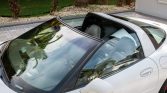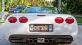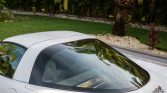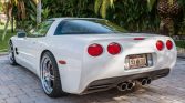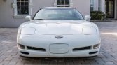 The car is finished in Speedway White and features a removable body-color roof panel, pop-up headlights, fog lights, body side moldings, a Corvette-branded front plate cover, and quad exhaust outlets.