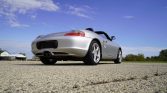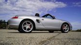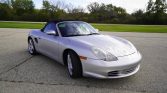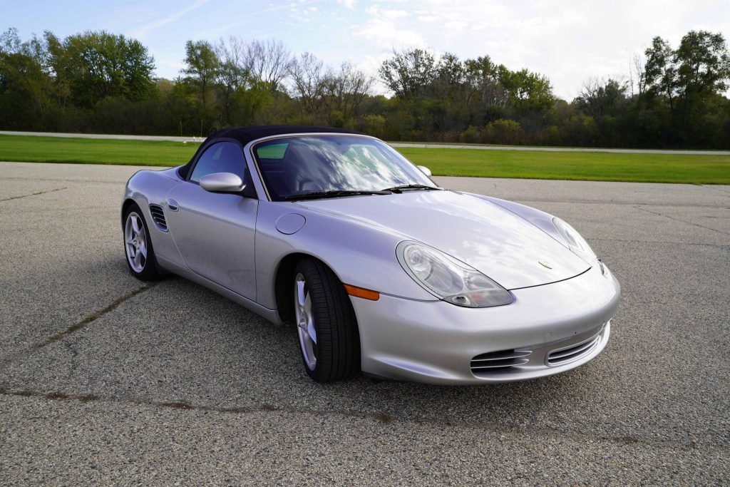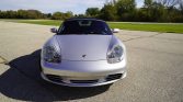 This 2003 Porsche Boxster S is finished in Arctic Silver Metallic over black leather and is powered by a 3.2-liter flat-six paired with a six-speed manual transaxle. Equipment includes a black soft top, a wind deflector, a deployable rear spoiler, automatic climate control, the Digital Sound package, heated seats, xenon headlamps, cross-drilled brake rotors, and 18″ Carrera alloy wheels.