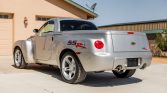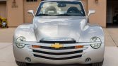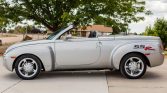 This 2004 Chevrolet SSR is powered by a 5.3-liter V8 paired with a four-speed automatic transmission and a limited-slip rear differential, and it is finished in silver over black leather. Equipment includes a power-operated retractable hardtop, staggered-diameter alloy wheels, a hard tonneau cover, heated and power-adjustable seats, and a Bose audio system.