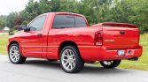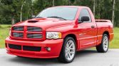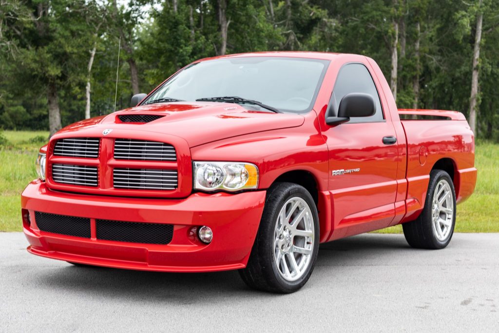 …This 2004 Dodge Ram SRT-10 is finished in Flame Red over black leather and is powered by an 8.3-liter V10 mated to a six-speed manual transmission and limited-slip differential. Additional equipment includes 22″ polished wheels, power-adjustable front seats, air conditioning, cruise control, performance suspension and braking systems, and an Infinity audio system. The truck was sold new by Humes Chrysler Dodge Jeep Ram of Waterford, Pennsylvania, and was acquired by the seller in July of 2020.