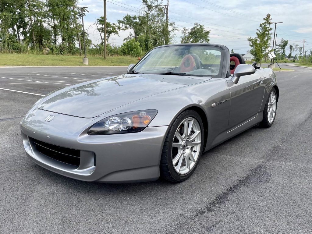 This 2004 Honda S2000 is finished in Silverstone Metallic over a red and black leather interior and powered by a 2.2-liter F22C VTEC inline-four paired with a six-speed manual transmission and a limited-slip differential. Modifications include a carbon-fiber air intake, titanium headers, coilovers, clear side markers, and an aftermarket stereo system. The car was delivered new to Martin Main Line Honda of Ardmore, Pennsylvania, and spent time in Texas and Florida before relocating to Tennessee, where it was acquired by the seller in May 2020.