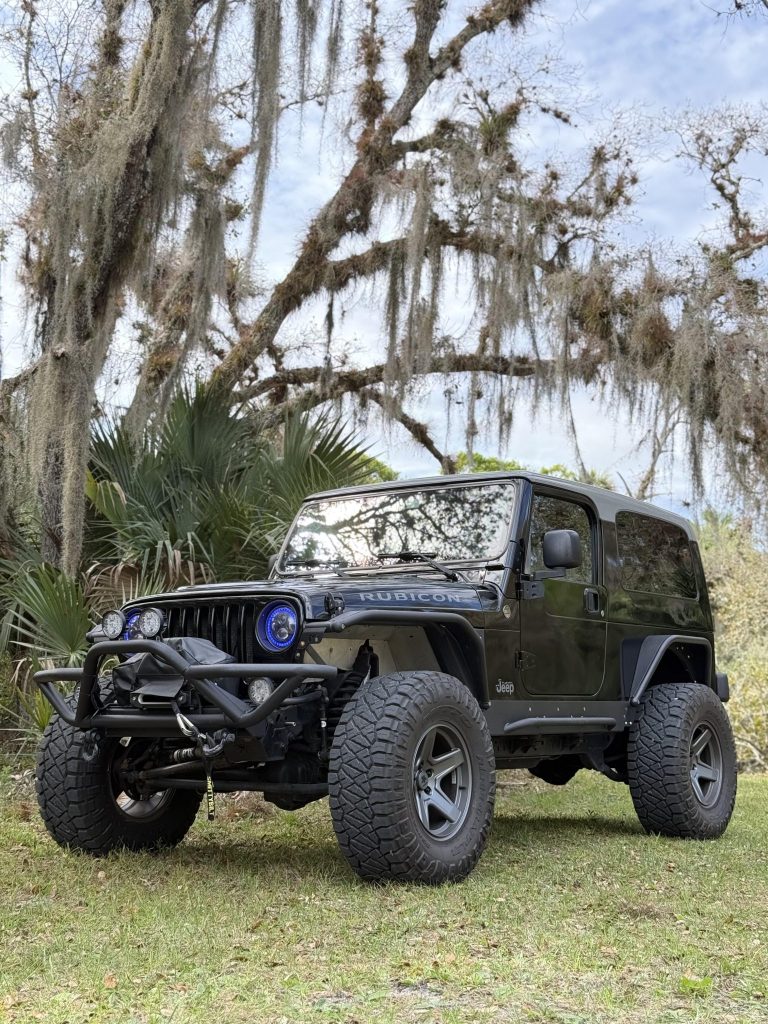 Charcoal-finished 17″ Mammoth wheels and 35×12.50″ Nitto Ridge Grappler tires were installed in November 2024. A mismatched spare is affixed to the swing-out rear carrier. The suspension is modified with a 4.5″ lift kit featuring a Fox steering stabilizer and Bilstein remote-reservoir shocks. Stopping power is provided by four-wheel disc brakes. A set of four Fuel wheels with 37×12.50″ Maxxis Trepador tires that match the current spare are included in the sale.