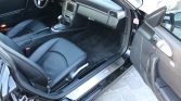 The cabin features seating upholstered in black leather with matching carpets, and satin silver trim accents the dash, center console, and door panels. Amenities include front seats with partial power adjustment, a thicker steering wheel rim, cruise control, a dash-mounted chronograph, automatic climate control, and PCM with navigation.
