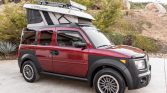 This 2008 Honda Element LX 4WD is finished in burgundy over gray cloth and equipped with a pop-up camper top, aftermarket dual–beam xenon headlights, a roof rack and basket, a ladder, a digital rear-view mirror, and a Kenwood touchscreen head unit with a back-up camera display. Additional features include 17″ Raceline wheels, air conditioning, reverse-hinged doors, a removable glass roof panel, tinted windows, sound deadening material, and a receiver hitch. Power is provided by a 2.4-liter inline-four paired with a five-speed automatic transaxle and a RealTime 4WD system.